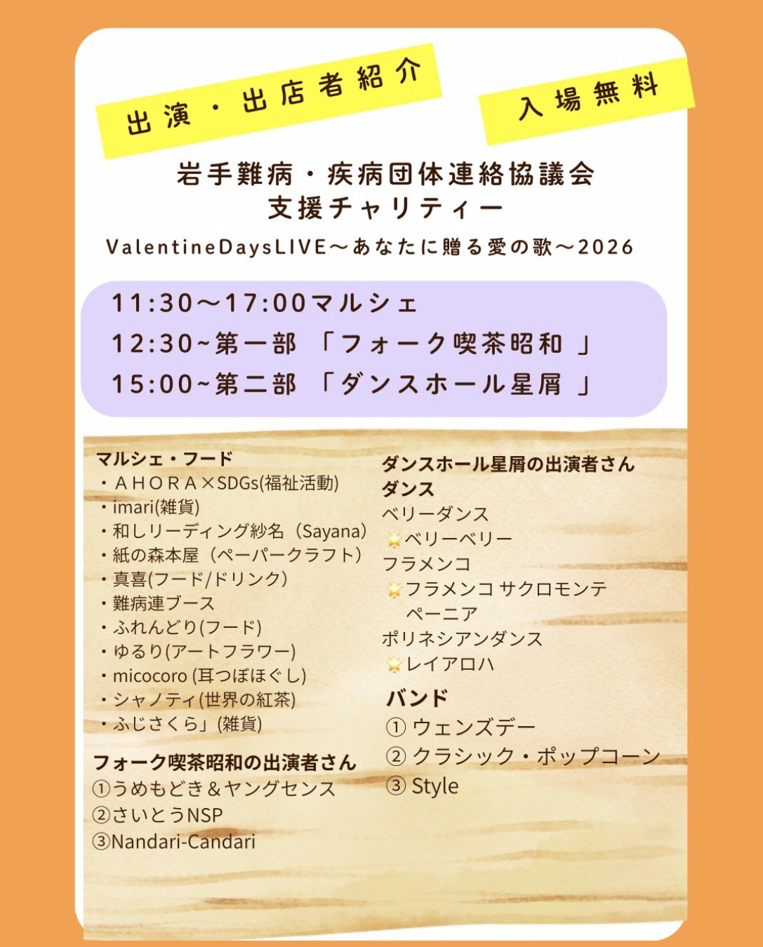 - ◎ 岩手県難病・疾病団体連絡協議会支援チャリティー 愛と感謝の気持ちを込めて Valentaine Days LIVE~あなたに贈る愛の歌~2026が開催されます。NEW