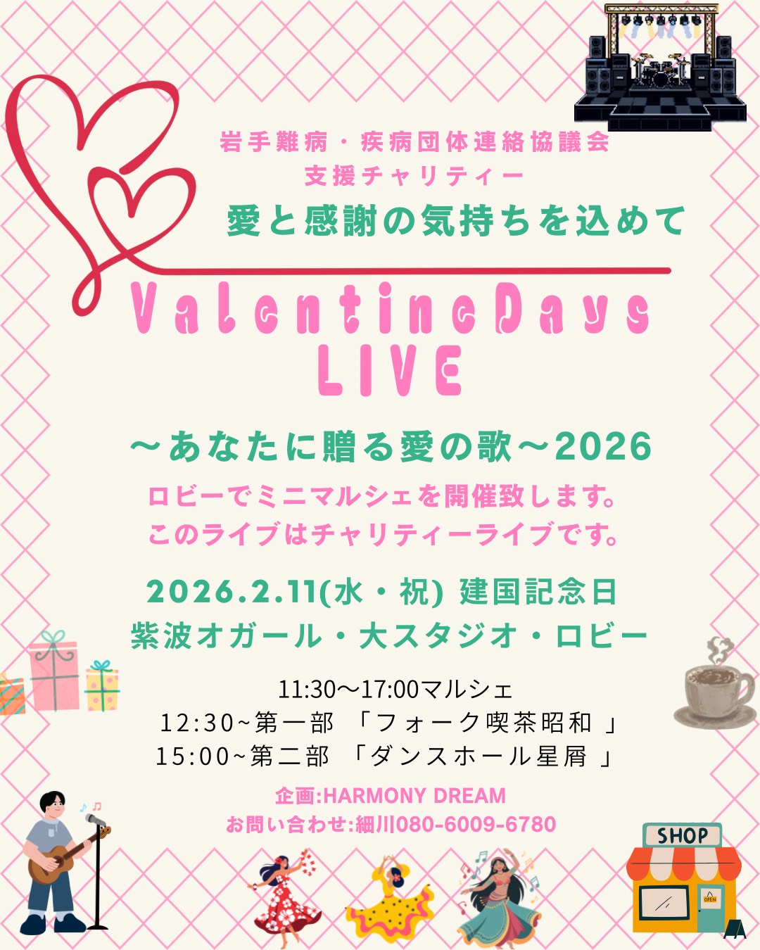 - ◎ 岩手県難病・疾病団体連絡協議会支援チャリティー 愛と感謝の気持ちを込めて Valentaine Days LIVE~あなたに贈る愛の歌~2026が開催されます。NEW