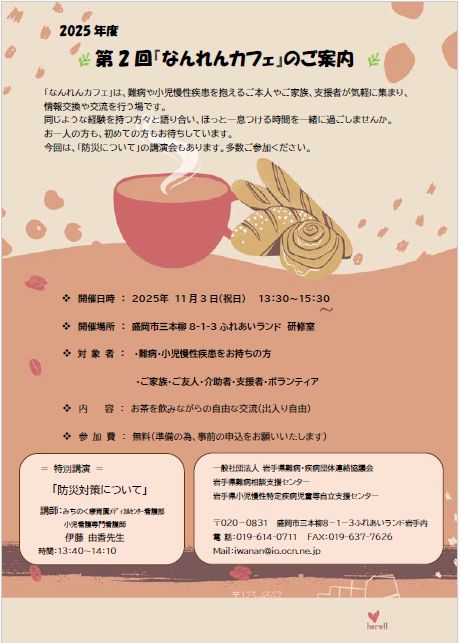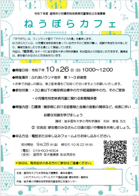チラシはこちら - ◎ 令和7年度 盛岡市小児慢性特定疾病児童等自立支援事業 ねうぼらカフェが開催されますNEW
